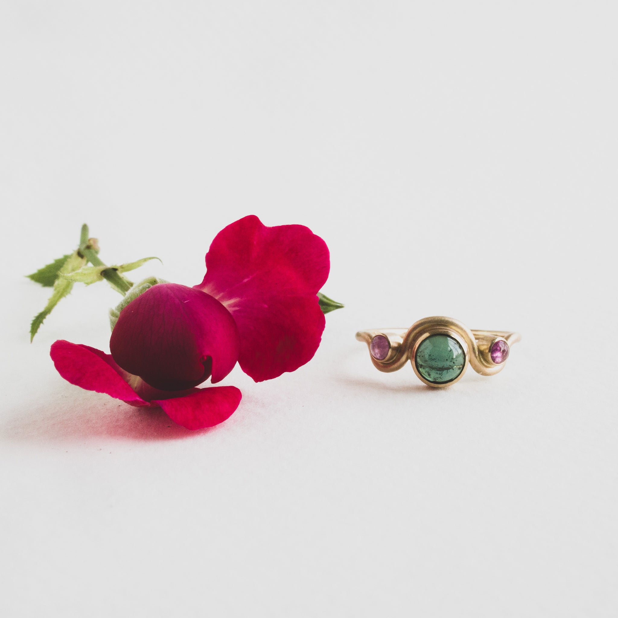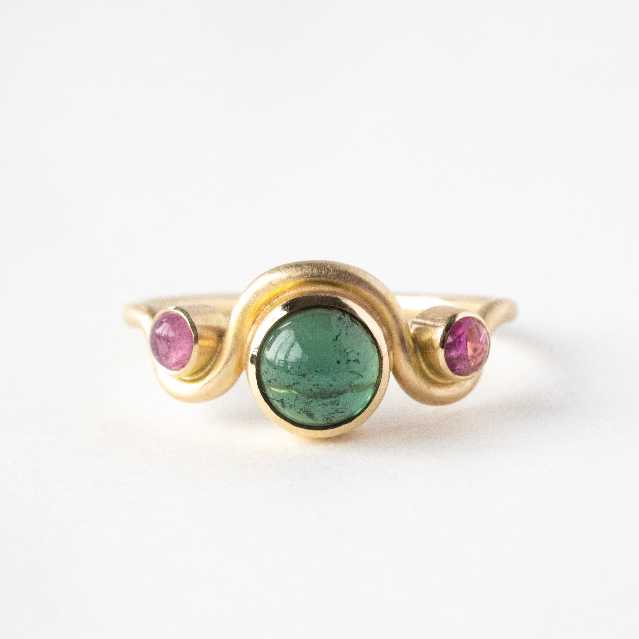 This ring features a beautiful 1.08ct 6.25mm green tourmaline, flanked by two 3mm pink tourmalines. 14 karat yellow gold winds around the stones and forms the ring band at the back. This unique ring would make the perfect engagement ring or special gift.