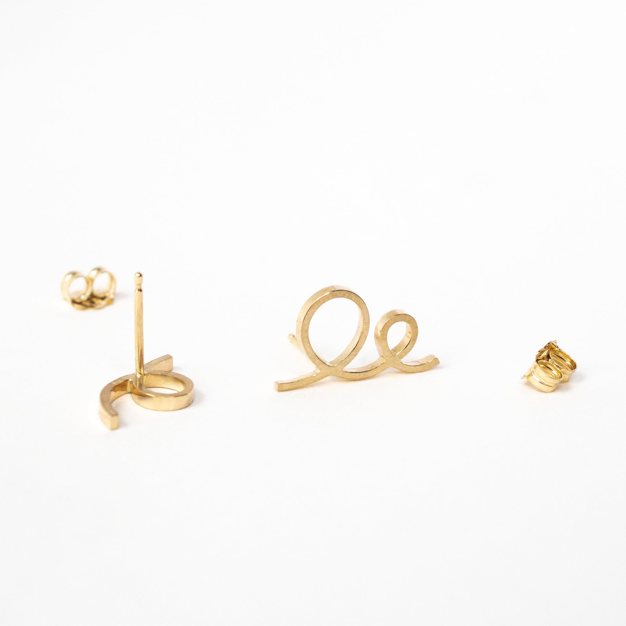 Unique, playful earrings handmade entirely in 14k yellow gold, these studs have 14k gold posts and friction earring backs. The larger earring measures 1.5cm in length and its pair is 1.1cm